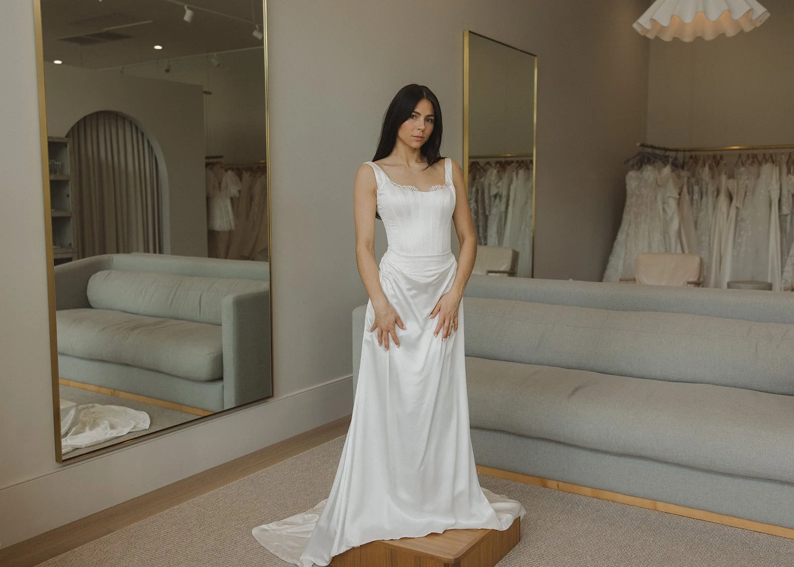 Our curated collection features designer gowns ranging from $2,500–$10,000, with the majority of our gowns falling between $3,000–$6,000. For our religious/modest brides, gowns begin at $3,000.